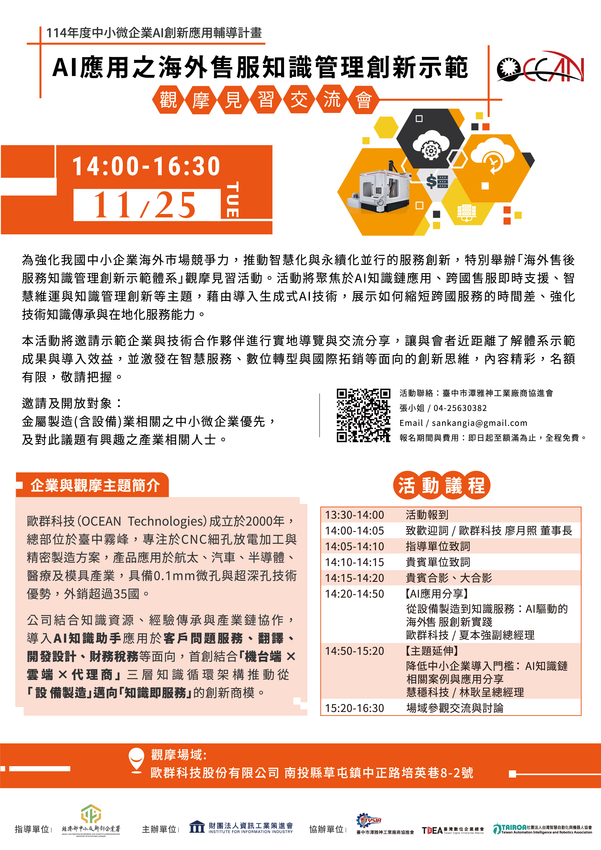 【代發】歡迎參加-11.25AI應用之海外售服知識管理創新示範觀摩見習交流會