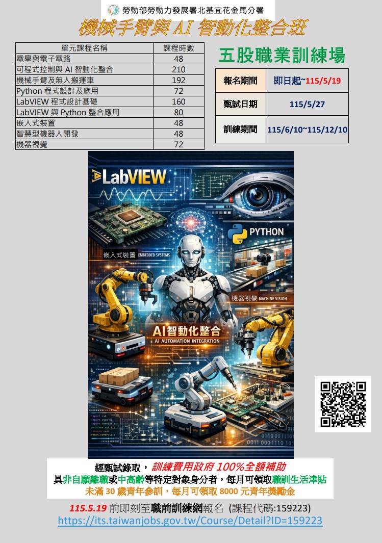 【代發】機械手臂與AI智動化整合班_勞動部勞動力發展署北基宜花金馬分署(五股職業訓練場)