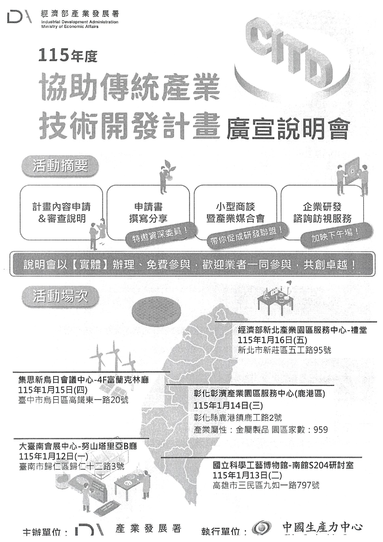 轉知經濟部產業發展署公告受理115年度「協助傳統產業技術開發計畫」(以下簡稱本計畫)個案計畫補助申請之計畫申請說明會相關訊息,惠請貴單位轉知相關承辦單位或廠商,請查照。