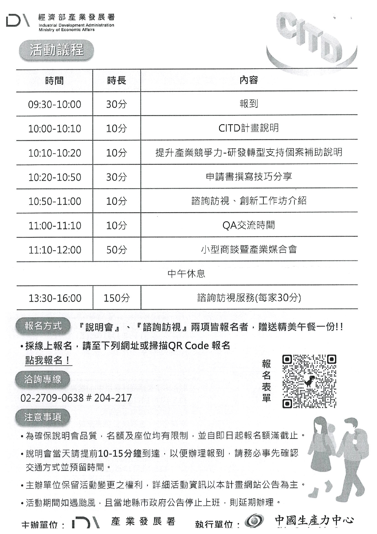 五、說明會並增設「諮詢訪視服務」,由專業顧問協助業者釐清研發方向與技術需求,強化技術開發規劃,協助突破新產品研發瓶頸,促進創新發展。