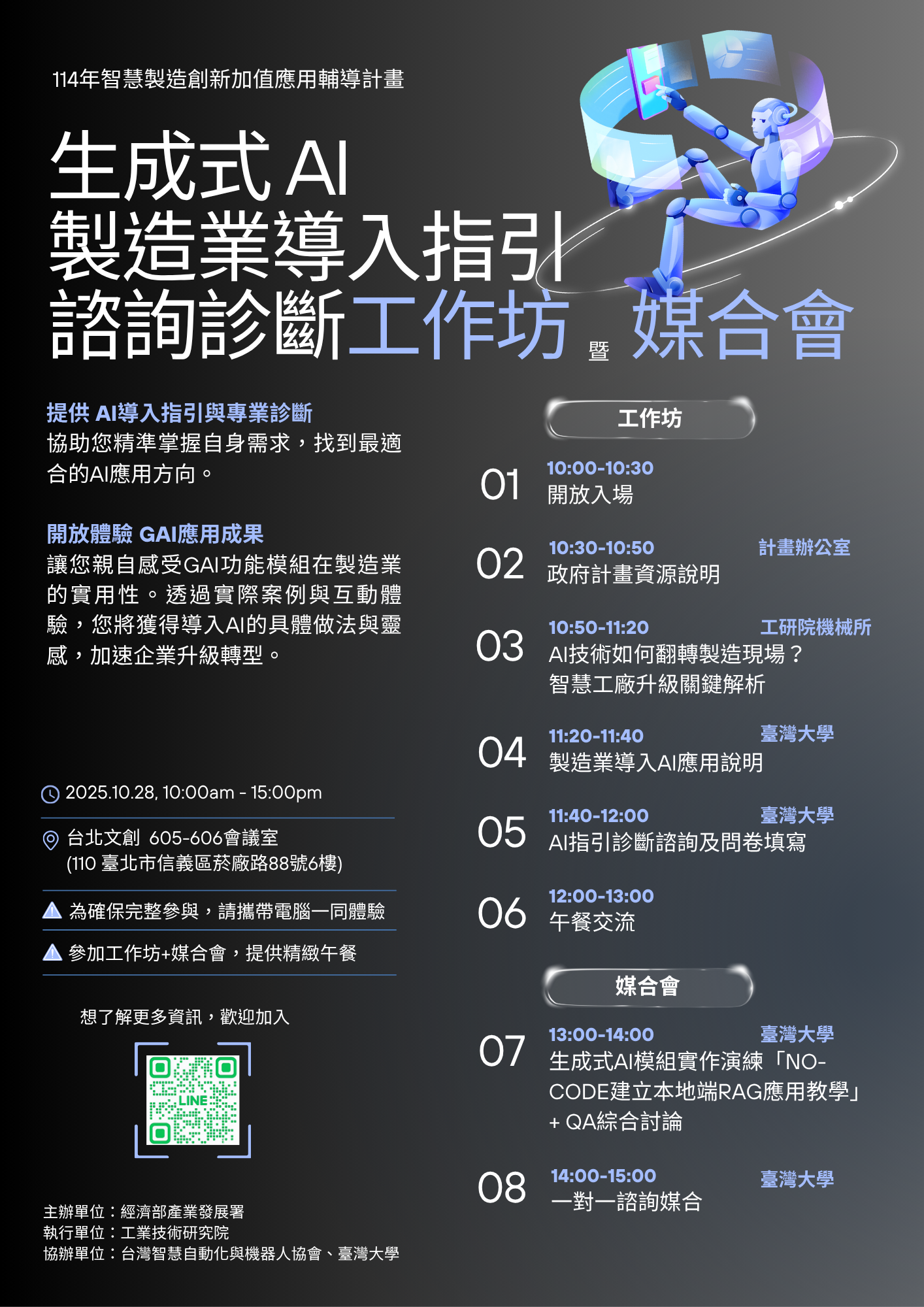 在工廠日常營運中,您是否也遇過這些問題? 庫存一會兒缺料停工,一會兒又積壓造成壓力 採購全憑經驗,下單不是太多就是太少 客戶追單、客服回應慢,常常要層層查詢 新人上線慢,還要資深員工手把手教 排班、人事行政繁瑣,容易出錯又耗時間 這些痛點,其實都能靠 GAI 來解決! 工作坊報名連結> 媒合活動報名連結>