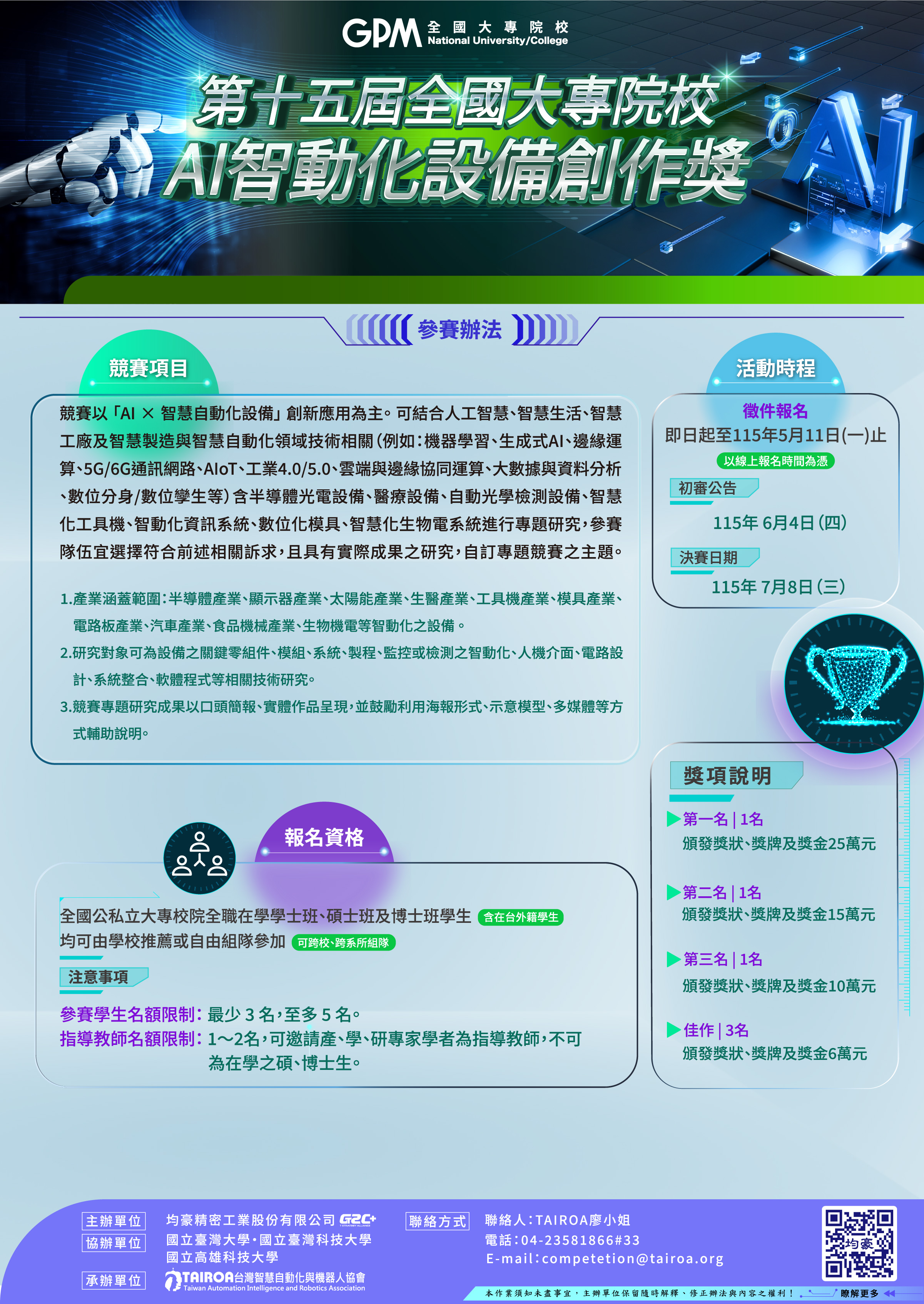 【最高獎金 25 萬元】第十五屆全國大專院校 AI 智動化設備創作獎