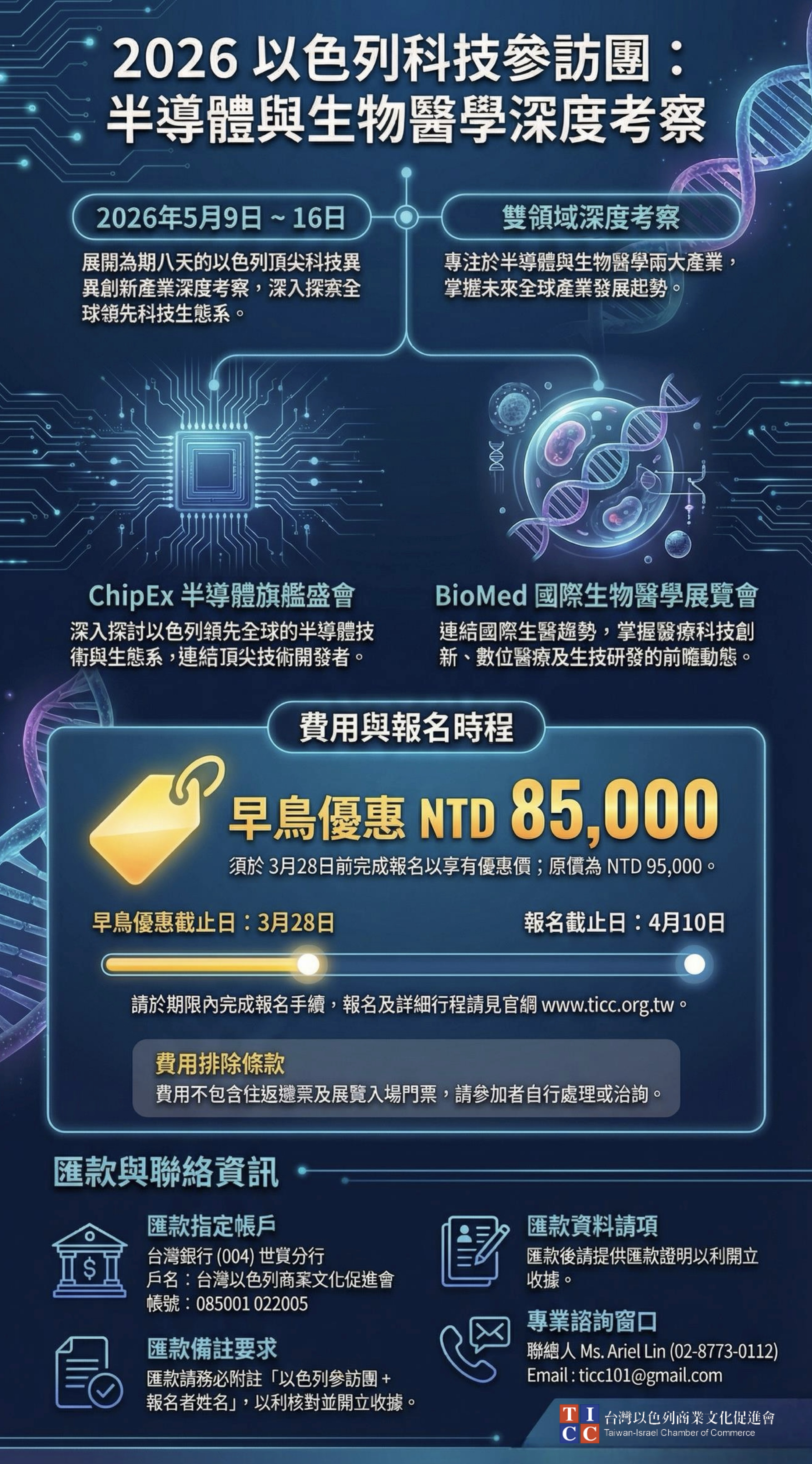 【2026年商務科技參訪團 “ChipEx”以色列國際半導體展& “BioMed” 國際生際醫材展】+ 以色列創新育成中心